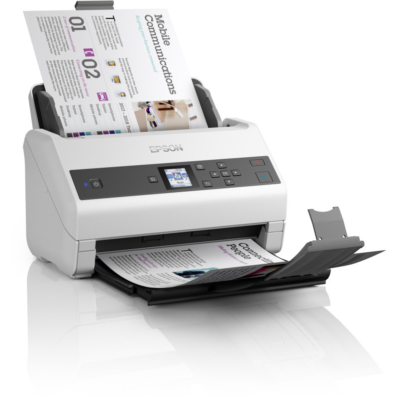 "Epson WorkForce DS-870. Optical scanning resolution: 600 x 600 DPI, Input colour depth: 30 bit, Output colour depth: 24 bit. Scanner type: Sheet-fed scanner, Product colour: Grey, White, Display: LCD. Sensor type: CIS, Daily duty cycle (max): 7000 pages, Scan file formats: JPEG, PDF, TIFF. Auto document feeder (ADF) input capacity: 100 sheets. Maximum ISO A-series paper size: A4, Scanning media types supported: Business Card, Plastic Card, Post Card(JPN), ISO A-series sizes (A0...A9): A3, A4, A5, A6"\n