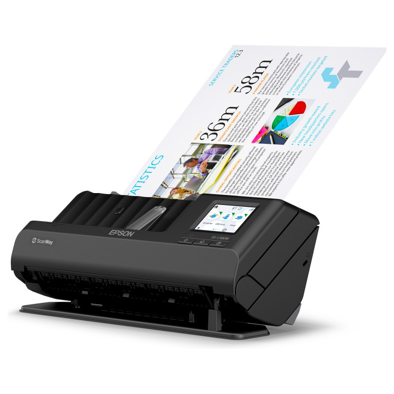 "Epson ES-C380W. Maximum scan size: 215.9 x 5588 mm, Optical scanning resolution: 600 x 600 DPI, Input colour depth: 30 bit. Scanner type: ADF + Sheet-fed scanner, Product colour: Black, Control type: Buttons. Daily duty cycle (max): 3500 pages, Light source: ReadyScan LED, Scan to: E-mail, FTP, Network folder, Print. Standard input capacity: 20 sheets. Maximum ISO A-series paper size: A4, Scanning media types supported: Business Card, Plastic Card, Post Card(JPN), ISO A-series sizes (A0...A9): A4, A5, A6"\n"Compact network scanner