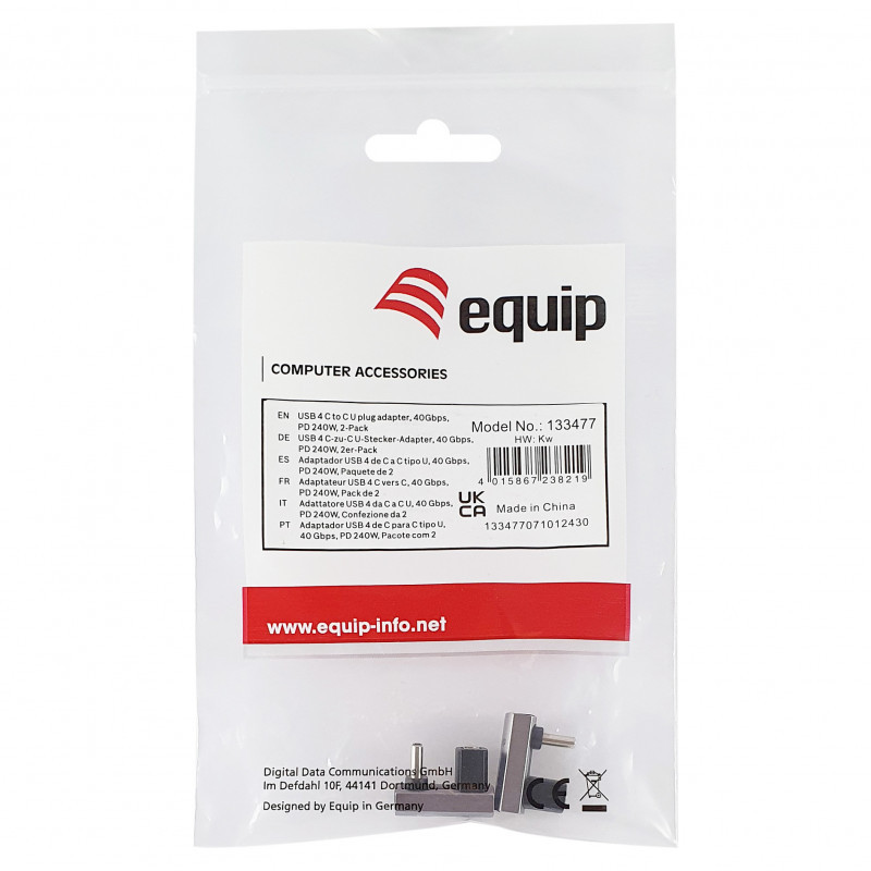"Equip USB 4 C-C U plug adapter, 40Gbps, PD 240W , 2-Pack. Connector 1: USB C, Connector 2: USB C. Product colour: Black, Grey"\n"The Equip 133477 USB 4 C-C U Plug Adapter is a cutting-edge connectivity solution designed to meet the demands of modern data transfer and power delivery needs. This adapter leverages the latest USB 4 technology, ensuring compatibility with a wide range of devices while providing enhanced performance and efficiency.