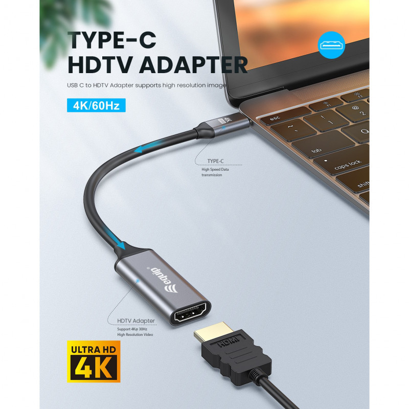 "Equip USB-C to HDMI 2.0 Adapter, 4K/60Hz. Cable length: 0.15 m, Connector 1: USB Type-C, Connector 2: HDMI. Compliance certificates: RoHS, CE. Weight: 9 g, Width: 18 mm, Depth: 9 mm. Package width: 23 mm, Package depth: 75 mm, Package height: 148 mm. Quantity per pack: 1 pc(s)"\n"The equip® USB-C to HDMI 2.0 adapter is a small device that allows you to connect your USB-C enabled devices such as laptops, tablets, or smartphones to an HDMI enabled display like a TV or a monitor. With support for HDMI 2.0 technology, this adapter can deliver 4K Ultra HD resolution at 60Hz refresh rate, which means you can enjoy high-quality video and audio content without any lag or delay. This adapter is easy to use and does not require any drivers or software installation, simply plug-and-play. It is a convenient and cost-effective way to extend the functionality of your USB-C device and enjoy high-quality multimedia content on a larger screen. "