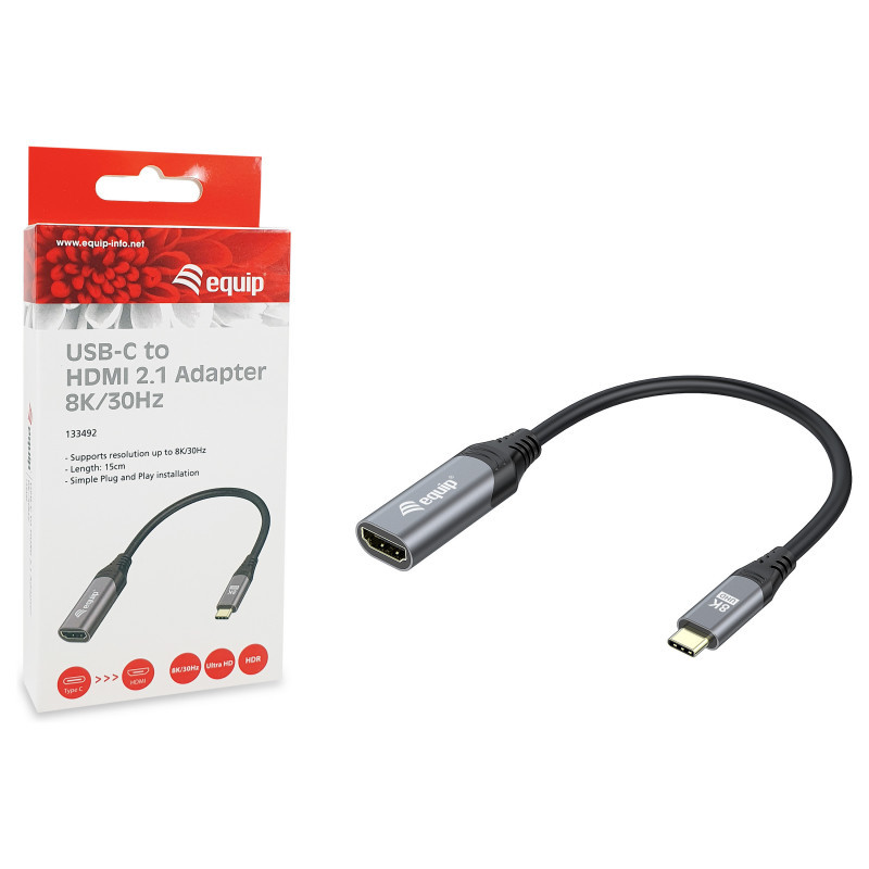 "Equip USB-C to HDMI 2.1 Adapter, 8K/30Hz. Cable length: 0.15 m, Connector 1: USB Type-C, Connector 2: HDMI. Compliance certificates: CE, RoHS. Weight: 30 g, Width: 230 mm, Depth: 20 mm. Package width: 23 mm, Package depth: 75 mm, Package height: 148 mm. Quantity per pack: 1 pc(s)"\n"