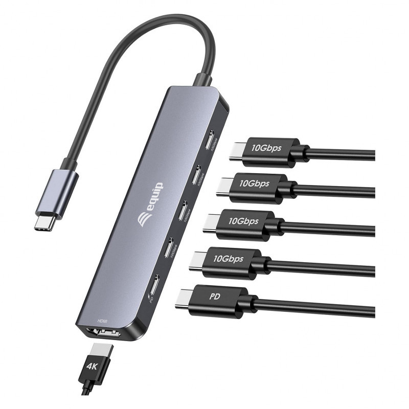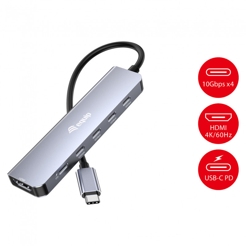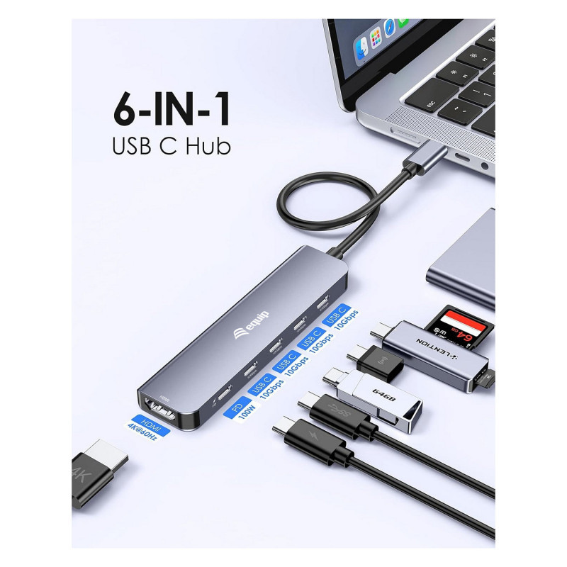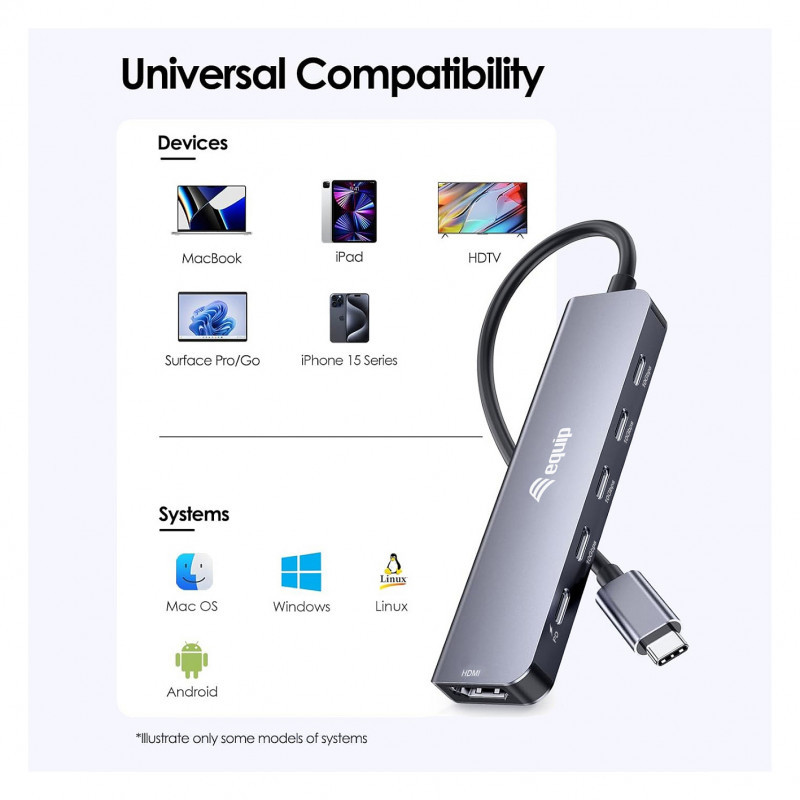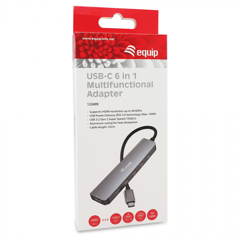 "Equip USB-C 6 in 1 Multifunctional Adapter, HDMI 4K/60Hz, USB-C Gen2 x 4 (10Gbps), 100W USB PD. Connectivity technology: Wired, Host interface: USB 3.2 Gen 2 (3.1 Gen 2) Type-C, USB Power Delivery up to: 100 W. Product colour: Grey, Data transfer rate: 10 Gbit/s, HD type: 4K Ultra HD. Power source type: USB, USB cable length: 0.25 m. Windows operating systems supported: Windows Vista, Windows Vista Business, Windows Vista Business x64, Windows Vista Enterprise,..., Mac operating systems supported: Mac OS X 10.5 Leopard, Mac OS X 10.6 Snow Leopard, Mac OS X 10.7 Lion, Mac OS X 10.7.5 Lion, Mac..., Mobile operating systems supported: Android 10.0, Android 11.0, Android 12.0, Android 13.0, Android 14.0, Android 5.0, Android 5.1,.... Width: 28 mm, Depth: 10 mm, Height: 360 mm"\n"The Equip 133499 USB-C 6-in-1 Multifunctional Adapter is designed to expand the connectivity options of modern laptops, tablets, and smartphones equipped with USB-C ports. With its compact and lightweight form factor, this versatile adapter combines multiple essential interfaces into one reliable solution, making it perfect for both professional and personal use.