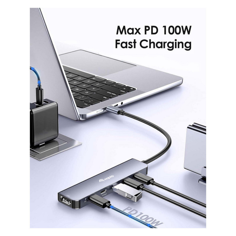 It features a high-definition HDMI output that supports resolutions up to 4K at 60Hz, allowing you to extend or mirror your display onto monitors, TVs, or projectors with smooth and detailed visuals—ideal for presentations, video streaming, and multitasking. Four USB-C Gen2 ports provide data transfer speeds up to 10Gbps, enabling fast synchronization of large files, external drives, cameras, and other peripherals. Additionally, the adapter supports 100W USB Power Delivery (PD) passthrough charging, ensuring your device remains powered even while multiple functions are in use."