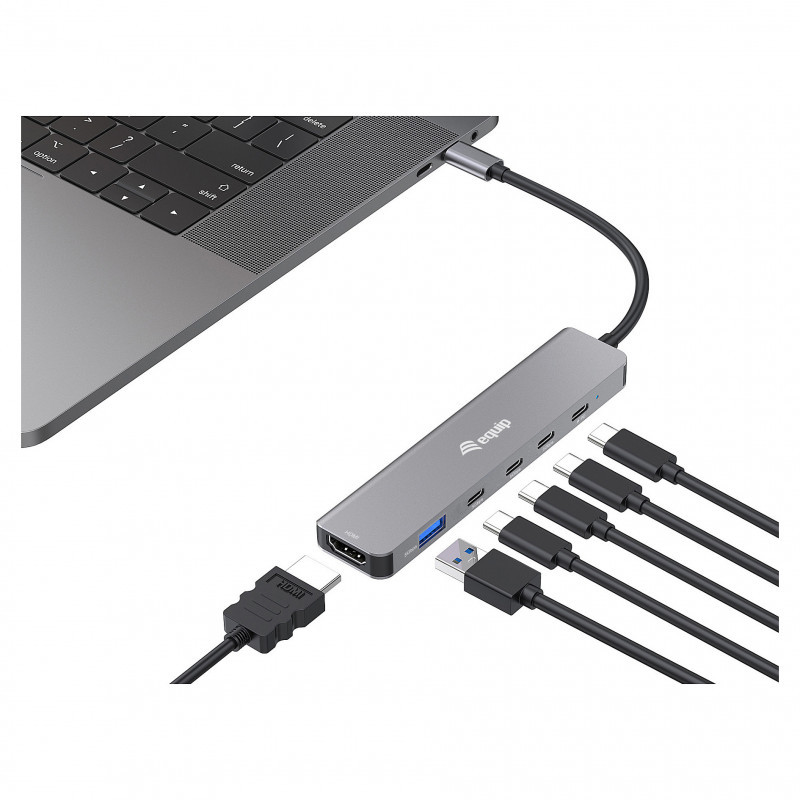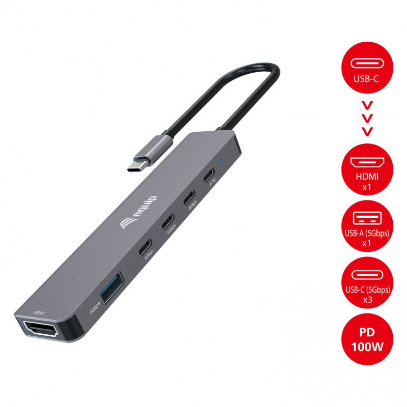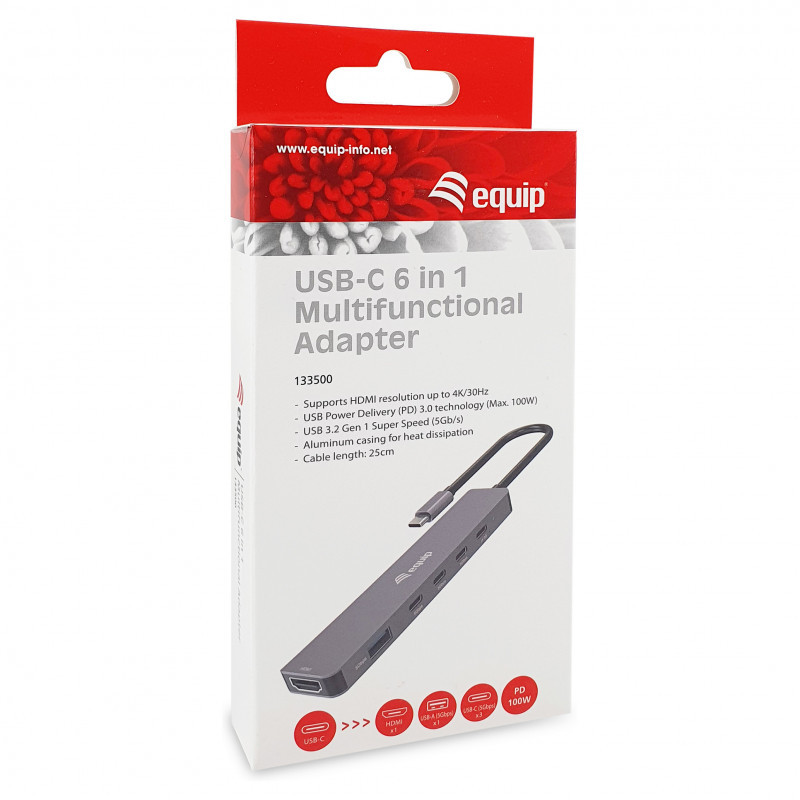"Equip USB-C 6 in 1 Multifunctional Adapter, HDMI 4K/30Hz, USB-C x 4 , USB-A x 1, 5Gbps, 100W USB PD. Connectivity technology: Wired, Host interface: USB 3.2 Gen 1 (3.1 Gen 1) Type-C, USB Power Delivery up to: 100 W. Product colour: Grey, HD type: 4K Ultra HD, Maximum digital resolution: 3840 x 2160 pixels. Power source type: USB, USB cable length: 0.25 m. Width: 113.3 mm, Depth: 28 mm, Height: 10 mm. Package width: 173 mm, Package depth: 23 mm, Package height: 75 mm"\n"The Equip 133500 USB-C 6-in-1 Multifunctional Adapter is a compact and versatile accessory designed to maximize the connectivity of modern laptops, tablets, and smartphones equipped with USB-C ports. Built with portability and convenience in mind, this adapter integrates six essential functions into one sleek device, eliminating the need to carry multiple dongles.