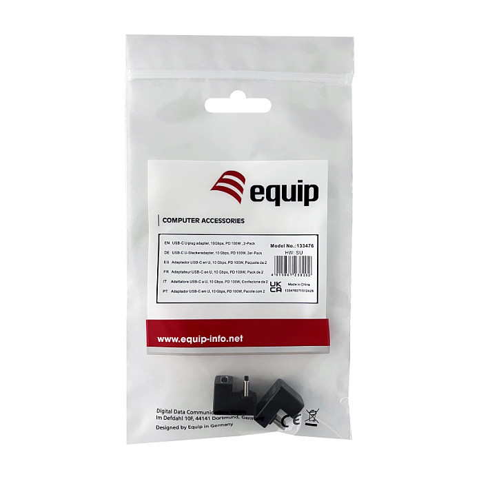 "Equip USB-C U plug adapter, 10Gbps, PD 100W, 2-Pack. Connector 1: USB C, Connector 2: USB C. Product colour: Black"\n"The Equip 133476 USB-C U plug Adapter is a practical and efficient accessory designed to optimize your device connections. This adapter features a unique 180-degree design, allowing you to connect USB-C cables and peripherals in tight spaces or at awkward angles without putting stress on the cables or ports. Its compact form factor ensures that it doesn’t add bulk, making it an ideal solution for use with laptops, tablets, smartphones, and other USB-C enabled devices.