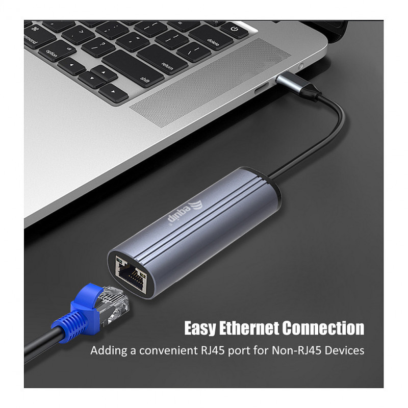 "Equip USB-C to RJ45 Gigabit Network + PD Adapter. Host interface: USB Type-C, USB Power Delivery up to: 100 W. Ethernet LAN data rates: 10,100,1000 Mbit/s. Product colour: Black, Grey, Hub interfaces: RJ-45, USB 3.2 Gen 1 (3.1 Gen 1) Type-C, Housing material: Aluminium. Windows operating systems supported: Windows 10, Windows 10 Education, Windows 10 Education x64, Windows 10 Enterprise, Windows 10..., Mac operating systems supported: Mac OS X 10.10 Yosemite, Mac OS X 10.11 El Capitan, Mac OS X 10.12 Sierra, Mac OS X 10.13 High..., Other operating systems supported: Android. Width: 25 mm, Depth: 17.8 mm, Height: 81 mm"\n"The equip® 133486 USB PD (Power Delivery) and Gigabit Ethernet Combo Adapter USB-C to Ethernet adapter provides reliability of Ethernet for your USB-C device. Where wireless connectivity is inconsistent, overextended, or even non-existent, this adapter allows you to connect seamlessly and with confidence. With the speed and reliability of Gigabit Ethernet, even the largest downloads can be possible without fear of interruption . In the same time can charge your laptop via the USB-C PD (Power Delivery)