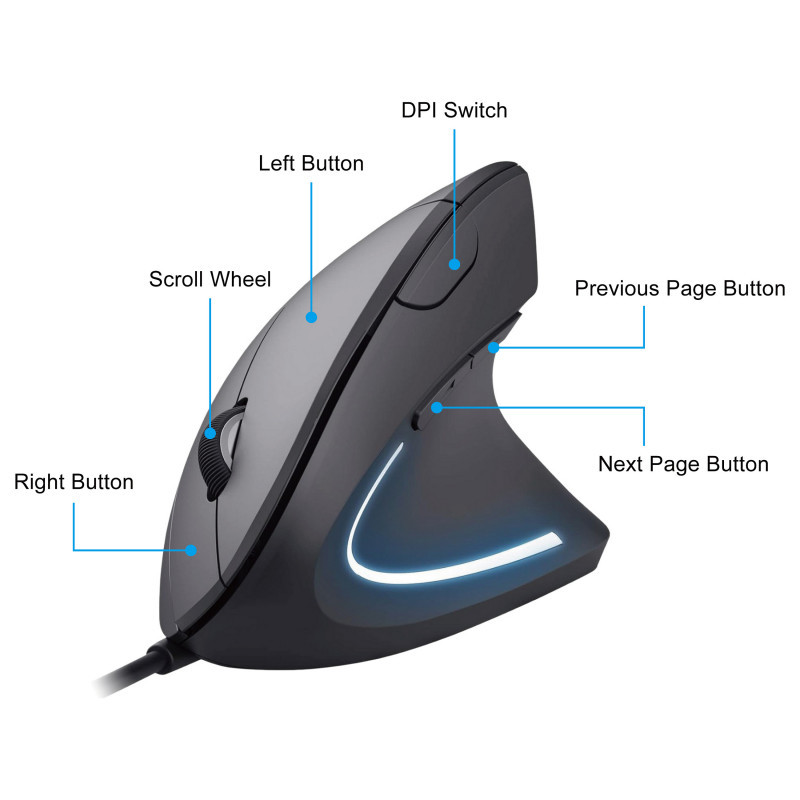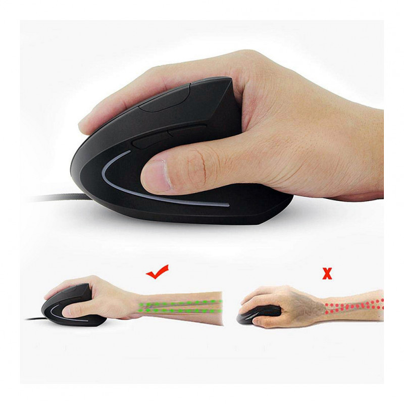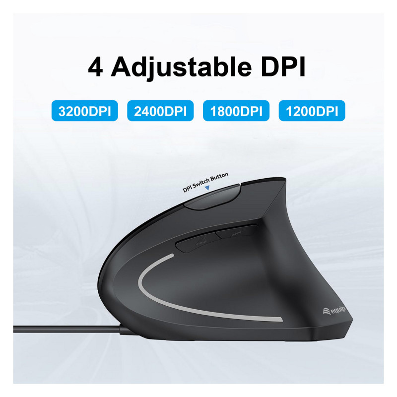 "Equip 245118. Form factor: Right-hand, Vertical design. Movement detection technology: Optical, Device interface: USB Type-A, Movement resolution: 3200 DPI, Buttons type: Pressed buttons, Buttons quantity: 6, Scroll type: Wheel. Illumination colour: Blue. Power source: Cable. Product colour: Black"\n"The Equip 245118 Vertical Ergonomic Wired Mouse is designed to provide optimal comfort and support for your hand, wrist, and forearm, making it an ideal choice for long hours of computer use. Unlike traditional mice, this vertical design promotes a natural handshake position that helps reduce strain and prevent repetitive stress injuries like carpal tunnel syndrome. Its contoured shape fits comfortably in your hand, allowing for precise control with minimal effort.