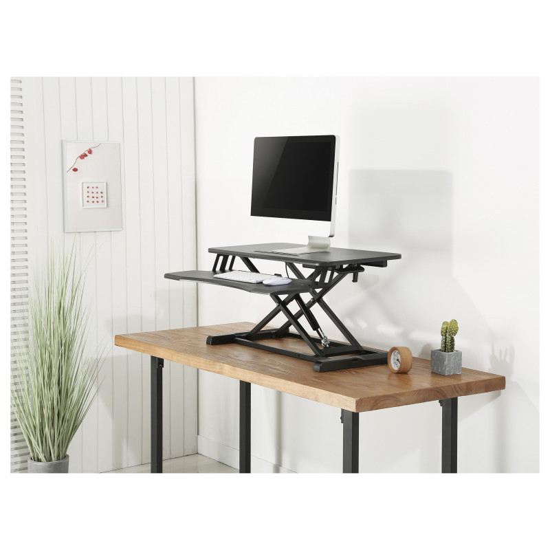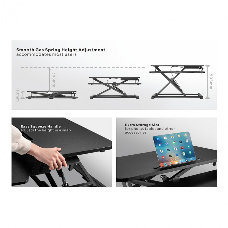 "Equip Ergonomic Sit/Stand Riser. Product colour: Black, Maximum weight capacity: 15 kg, Mounting type: Desk. Height adjustment range: 115 - 510 mm. Width: 800 mm, Depth: 580 mm, Weight: 10.5 kg. Package width: 885 mm, Package depth: 185 mm, Package height: 495 mm. Compliance certificates: RoHS"\n"The equip® ERGO 650840 can provide you quickly and easily adjust your desk into an ergonomic standing workstation. Simply change the height rise the stand from between 11 to 51cm, Thanks to the squeeze handle with gas spring, this is done smoothly and effortlessly. With the built-in slot holder and lower keyboard/mouse table, more space is gained for equipment and office items. And allows you to enable a correct sitting/stand holder for working, as your cervical vertebra relieves