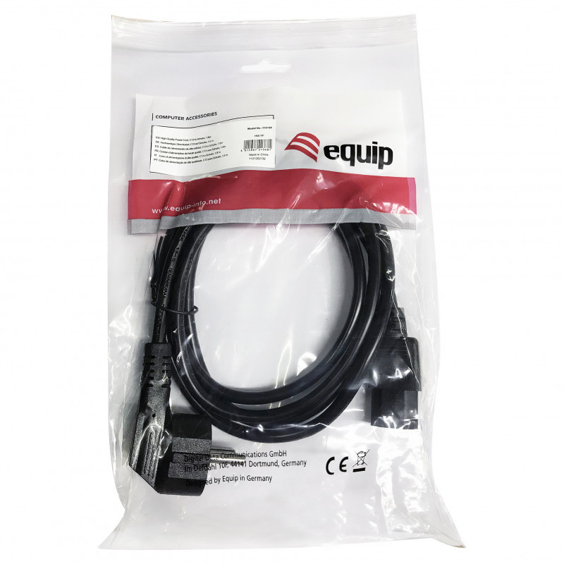 "Equip High Quality Power Cord, C13 to Schuko. Cable length: 1.8 m, Connector 1: C13 coupler, Connector 2: CEE7/4"\n"The equip® High Quality Power Cord is designed to carry clear and crisp electricity, building a sustainable power supply environment."