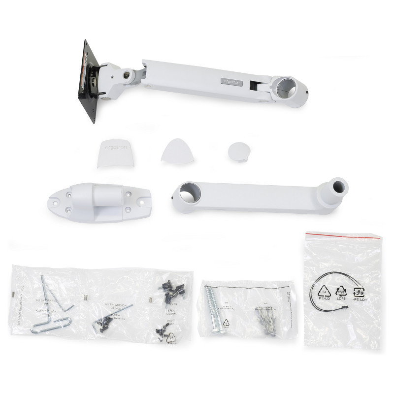 "Ergotron LX Series LX Wall Monitor Arm (white). Mounting: Screws, Maximum weight capacity: 11.3 kg, Minimum screen size: 50.8 cm (20""), Maximum screen size: 86.4 cm (34""), Minimum VESA mount: 75 x 75 mm, Maximum VESA mount: 100 x 100 mm. Height adjustment, Tilt angle range: 5 - 75°. Product colour: White"\n"Find your best view, save desk space and discover your most productive self, thanks to the LX Wall Monitor Arm. Place your screen where you need it for each project, and then reclaim a space full of opportunities by folding the arm and pushing it aside during a much-needed screen break."