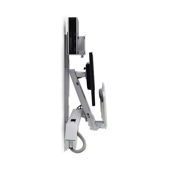With Small CPU Holder. This complete system provides easy re-positioning of your entire workstation—move your display, keyboard, mouse and barcode scanner in a single motion!