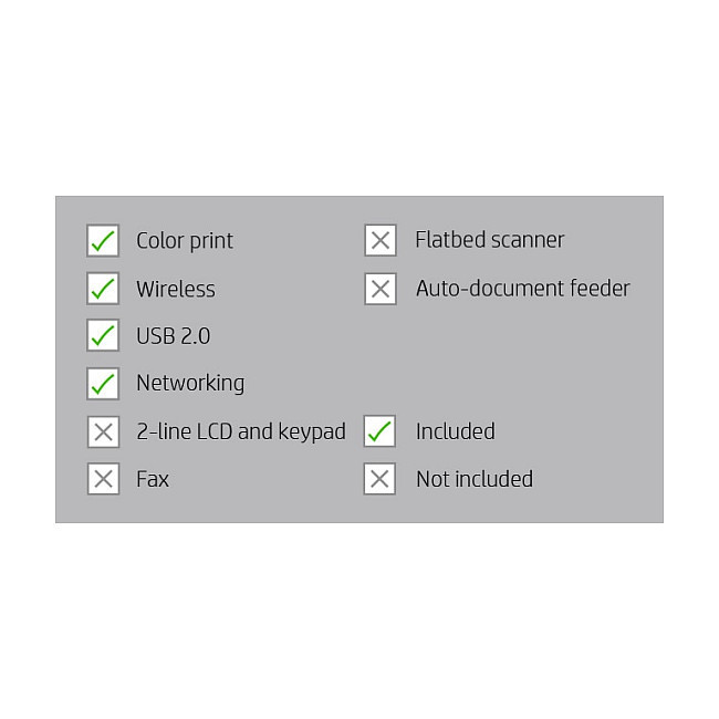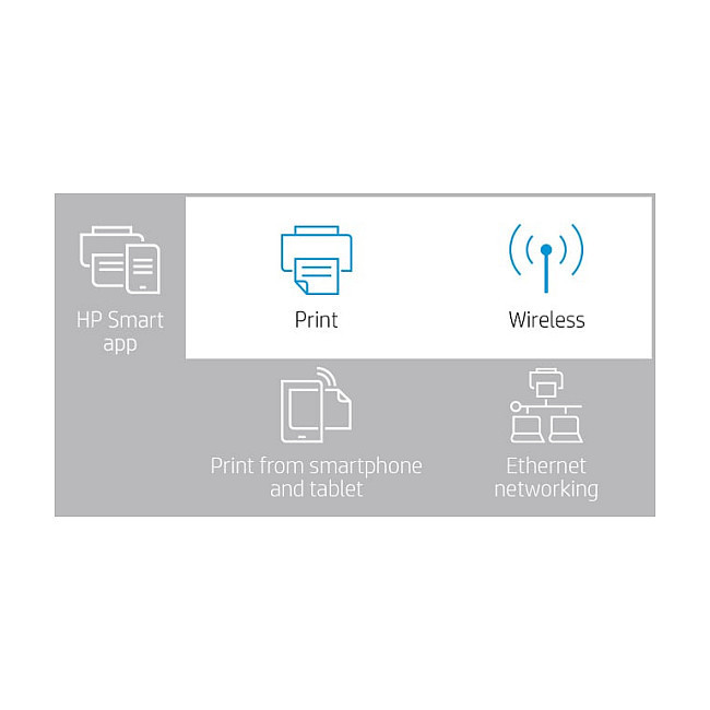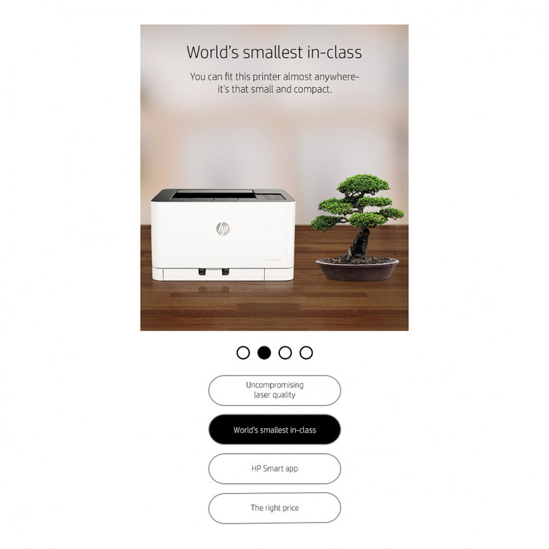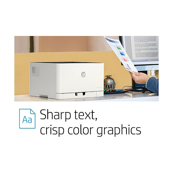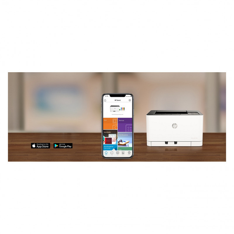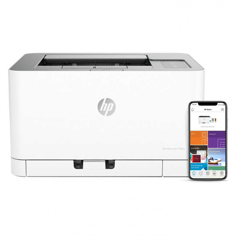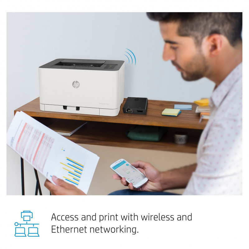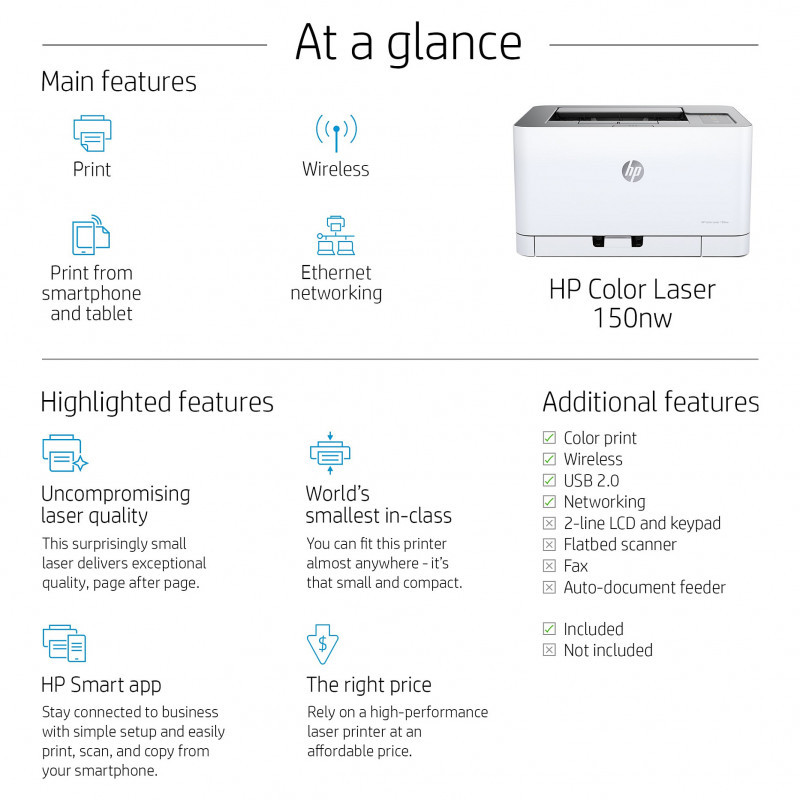 "HP Color Laser 150nw. Print technology: Laser, Colour. Number of print cartridges: 4, Maximum duty cycle: 20000 pages per month. Maximum resolution: 600 x 600 DPI. Maximum ISO A-series paper size: A4. Print speed (black, normal quality, A4/US Letter): 18 ppm, Duplex printing. Display: LED. Network ready, Wi-Fi. Product colour: White"\n" Get productive print performance – world's smallest colour laser in it's class.[1] Print, and scan, produce high-quality colour results, and print and scan from your phone.[2]