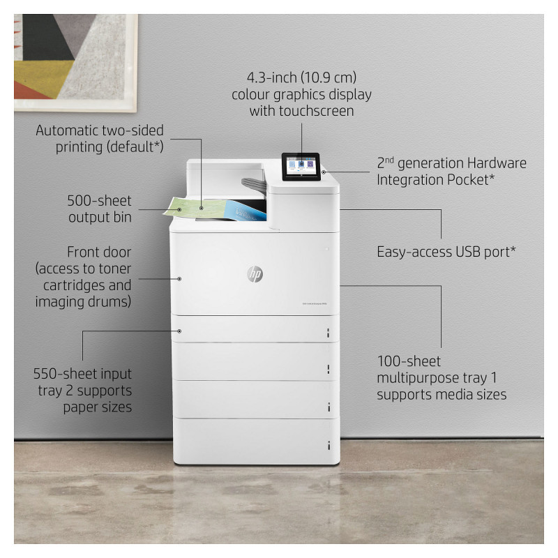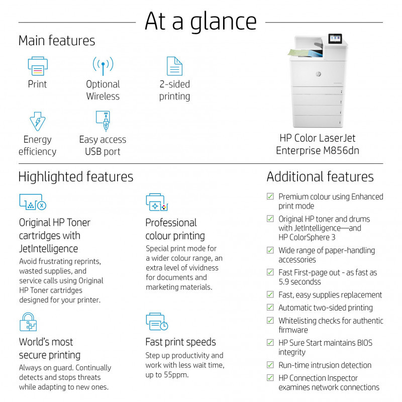 "HP Color LaserJet Enterprise M856dn. Print technology: Laser, Colour. Number of print cartridges: 4, Maximum duty cycle: 250000 pages per month. Maximum resolution: 1200 x 1200 DPI. Maximum ISO A-series paper size: A3. Print speed (black, normal quality, A4/US Letter): 56 ppm, Duplex printing. Display: CGD. Network ready, Wi-Fi. Product colour: White"\n" Print phenomenal colour while maximising uptime – now with original HP JetIntelligence toner technology. Expect consistently fast output, brilliant prints, and the world’s strongest security.[1]