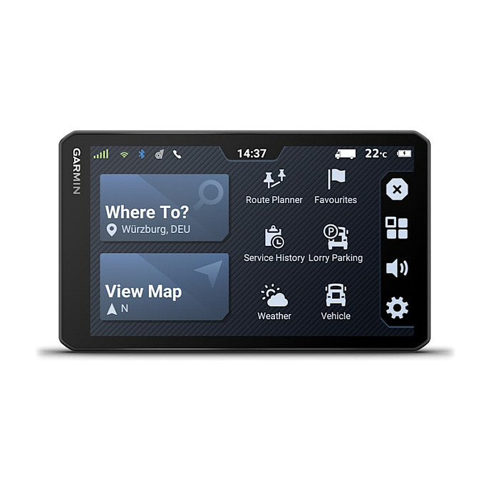 "Garmin dēzl LGV720. Display diagonal: 17.6 cm (6.95""), Display resolution: 1024 x 600 pixels, Display: TFT. Storage media type: Flash, Memory card, Compatible memory cards: MicroSD (TransFlash), Internal storage capacity: 32 GB. Mobile operating systems supported: Android, iOS. Form factor: Fixed, Product colour: Black. Power source type: DC, Battery technology: Lithium-Ion (Li-Ion), Battery type: Built-in"\n
