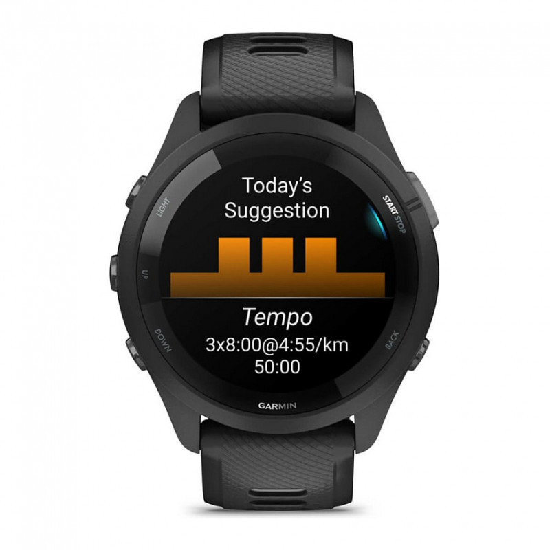 "Garmin Forerunner 265. Display diagonal: 3.3 cm (1.3""), Display technology: AMOLED, Display resolution: 416 x 416 pixels, Touchscreen. Flash memory: 8 GB. Wi-Fi. GPS (satellite). Weight: 47 g. Band material: Silicone, Band colour: Black, Grey, Band size: One Size"\n"TRAIN BRILLIANTLY WITH AN AMOLED DISPLAY