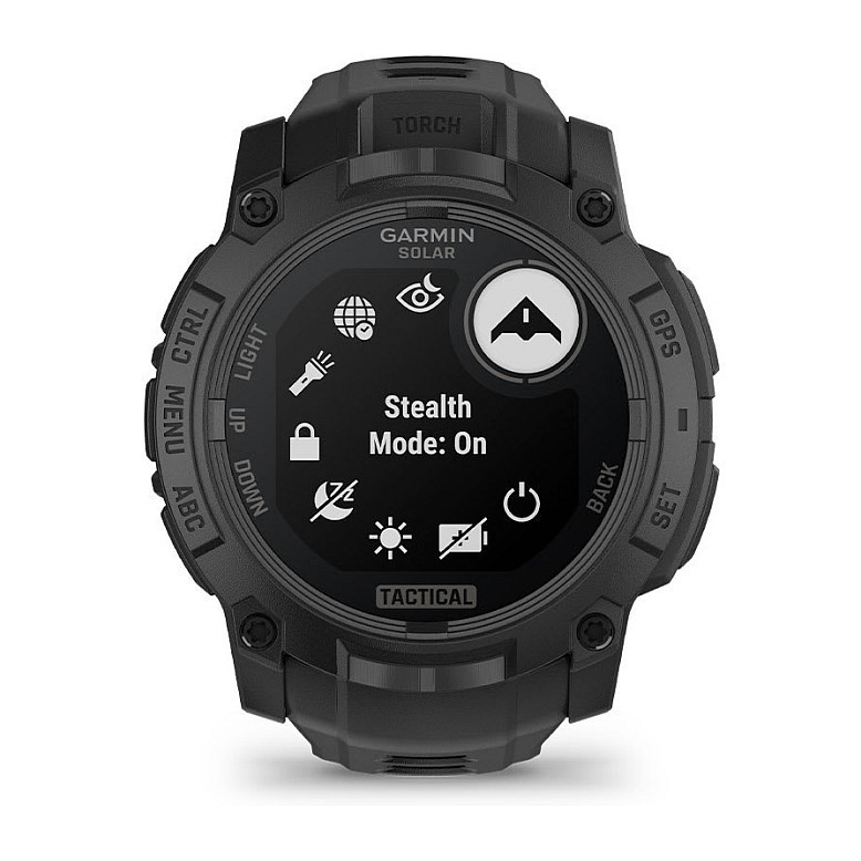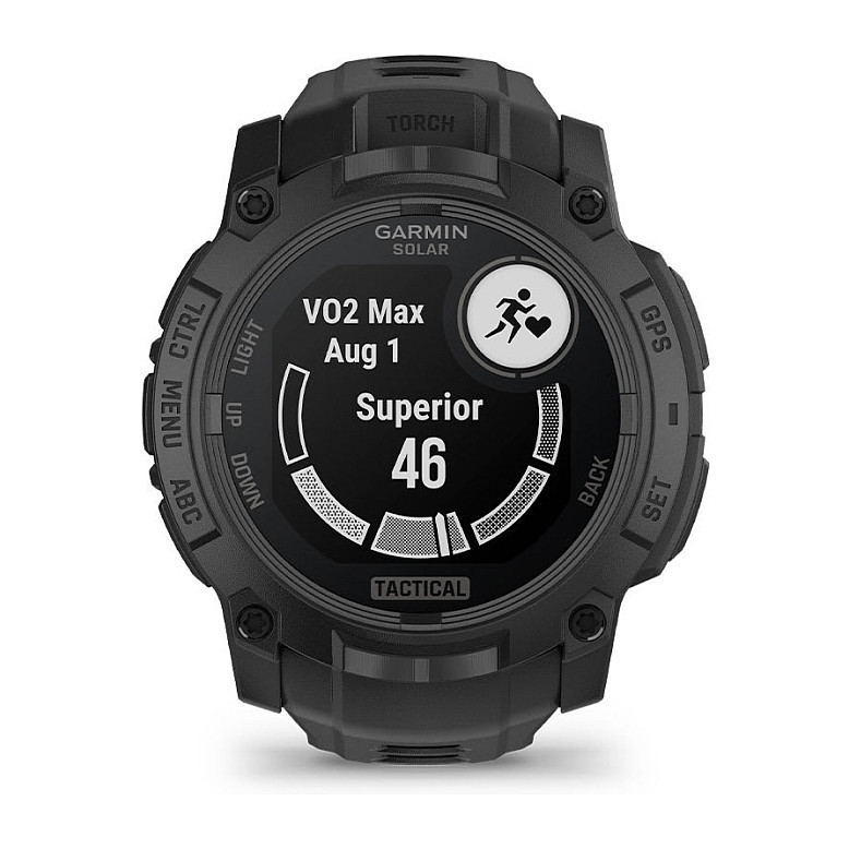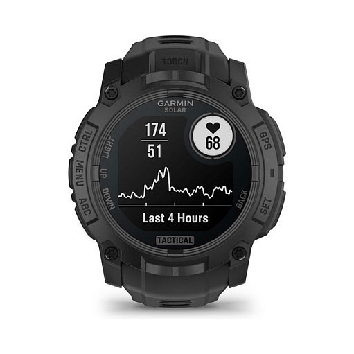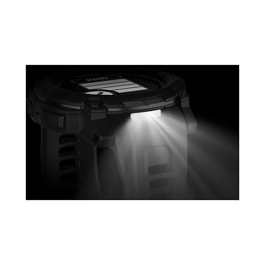 "Garmin Instinct . Display diagonal: 3.05 cm (1.2""), Display technology: AMOLED, Display resolution: 390 x 390 pixels, Touchscreen. Flash memory: 4 GB. GPS (satellite). Weight: 53 g. Band material: Silicone, Band colour: Black"\n"TOUGH IT OUT
