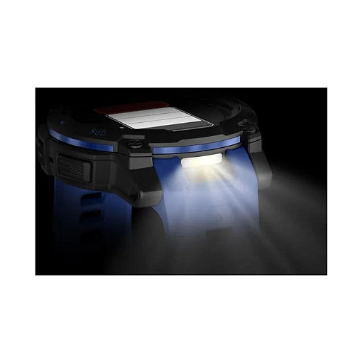 See and be seen with a built-in flashlight, featuring variable intensities and an alternate red light.