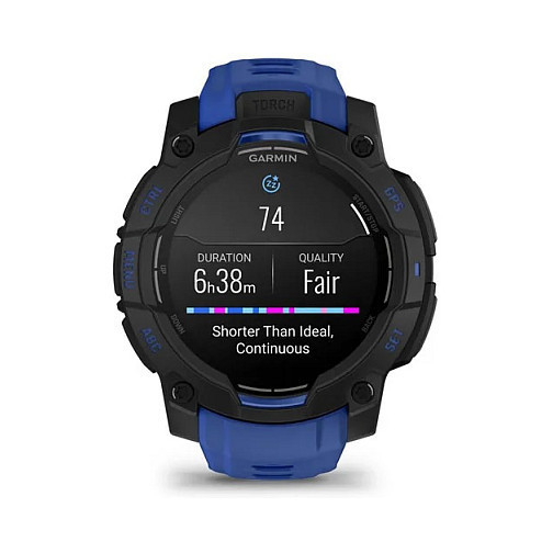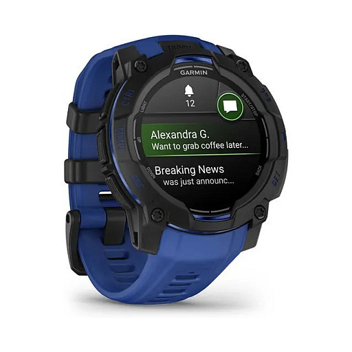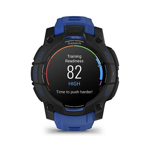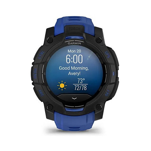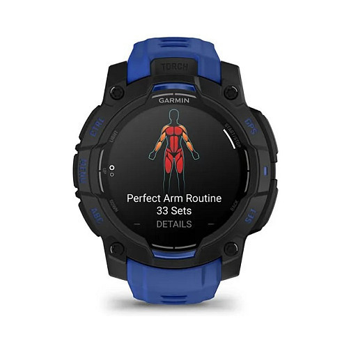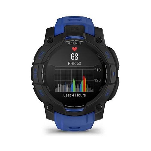 "Garmin Instinct 3. Display diagonal: 3.05 cm (1.2""), Display technology: AMOLED, Display resolution: 390 x 390 pixels. GPS (satellite). Weight: 53 g. Band material: Silicone, Band colour: Black, Blue"\n"TOUGH IT OUT