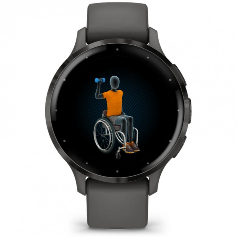 "Garmin Venu 3S. Display diagonal: 3.05 cm (1.2""), Display technology: AMOLED, Display resolution: 390 x 390 pixels, Touchscreen. Wi-Fi. GPS (satellite). Weight: 40 g. Band material: Silicone, Band colour: Grey"\n