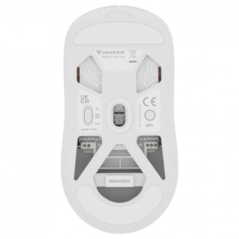 "GENESIS NMG-2194. Form factor: Ambidextrous. Movement detection technology: Optical, Device interface: Bluetooth + USB Type-C, Movement resolution: 26000 DPI, Buttons quantity: 6, Scroll type: Ring, Acceleration (max): 50 G. Power source: Batteries/Cable. Product colour: White"\n"Triple communication mode, one of the best optical sensors and an even lighter weight of just 57 grams, and that's not all. Here is the GENESIS Zircon 660 Pro, which offers even more. Whether you're a novice gamer or an advanced e-sports gaming fan, the GENESIS Zircon 660 Pro offers reliability, comfort and top-of-the-line features to give you a real edge.