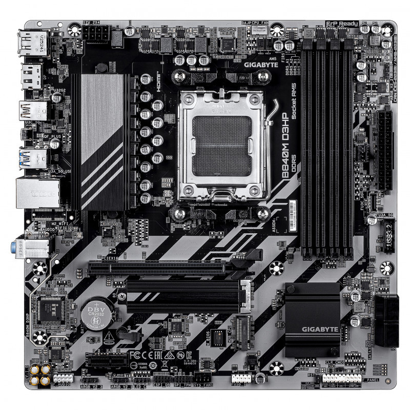 "GIGABYTE B840M D3HP Motherboard - AMD Ryzen 9000 CPUs, 8+2+2 Phases VRM, up to 8200MHz DDR5(O.C), 2xPCIe 4.0 M.2, 1GbE LAN, USB 3.2 Gen 2. Processor manufacturer: AMD, Processor socket: Socket AM5, Compatible processor series: AMD Ryzen 7000 Series, AMD Ryzen 8000 Series, AMD Ryzen 9000 Series. Supported memory types: DDR5-SDRAM, Maximum internal memory: 256 GB, Memory slots type: DIMM. Supported storage drive interfaces: M.2, PCI Express 4.0, SATA III, Supported storage drive types: HDD & SSD, RAID levels: 0, 1, 10, 5. Maximum resolution: 4096 x 2160 pixels. Ethernet interface type: Gigabit Ethernet, LAN controller: Realtek RTL8111H"\n"Elevate your computing experience with GIGABYTE's renowned motherboard series: AORUS, AERO, and GIGABYTE. Featuring innovative designs and advanced features, these boards offer exceptional performance and reliability. Whether you're a gamer, content creator, or professional, our series cater to your needs, ensuring uncompromising quality and cutting-edge technology."