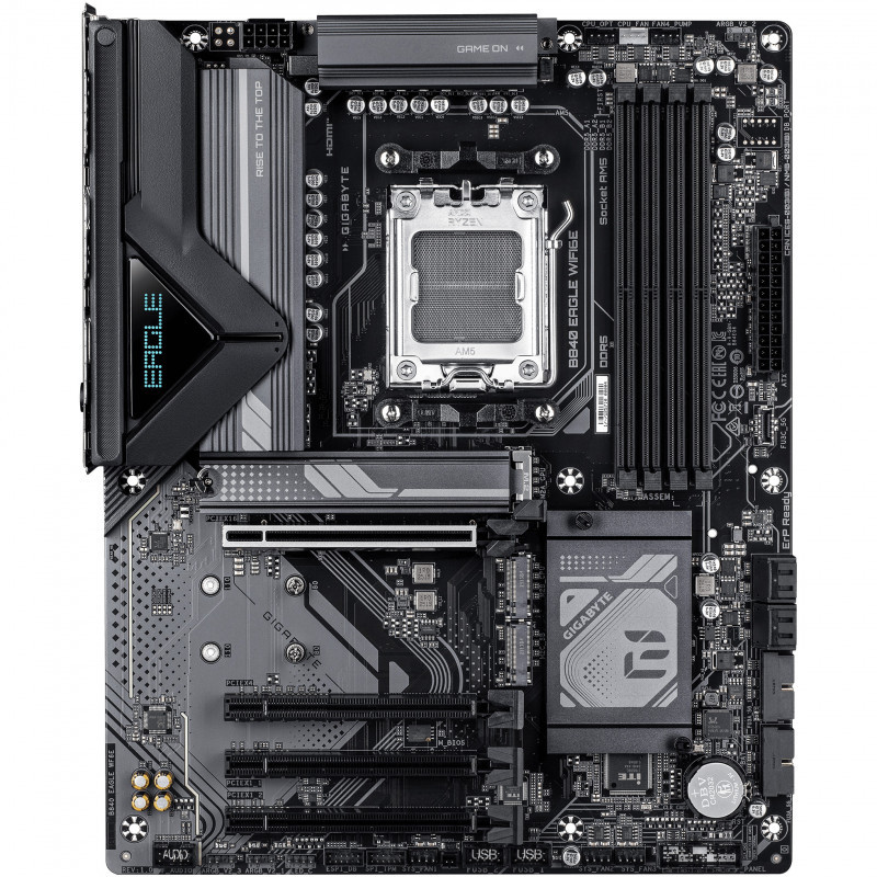 "GIGABYTE B840 EAGLE WIFI6E Motherboard - AMD Ryzen 9000 CPUs, 8+2+2 Phases VRM, up to 8200MHz DDR5(O.C), 2xPCIe 4.0 + 1xPCIe 3.0 M.2, Wi-Fi 6E, 2.5GbE LAN, USB 3.2 Gen 2. Processor manufacturer: AMD, Processor socket: Socket AM5, Compatible processor series: AMD Ryzen 7000 Series, AMD Ryzen 8000 Series, AMD Ryzen 9000 Series. Supported memory types: DDR5-SDRAM, Maximum internal memory: 256 GB, Memory slots type: DIMM. Supported storage drive interfaces: M.2, PCI Express 3.0, PCI Express 4.0, SATA III, Supported storage drive types: HDD & SSD, RAID levels: 0, 1, 5, 10. Maximum resolution: 4096 x 2160 pixels. Ethernet interface type: 2.5 Gigabit Ethernet, LAN controller: Realtek RTL8125, Top Wi-Fi standard: Wi-Fi 6E (802.11ax)"\n"Elevate your computing experience with GIGABYTE's renowned motherboard series: AORUS, AERO, and GIGABYTE. Featuring innovative designs and advanced features, these boards offer exceptional performance and reliability. Whether you're a gamer, content creator, or professional, our series cater to your needs, ensuring uncompromising quality and cutting-edge technology."