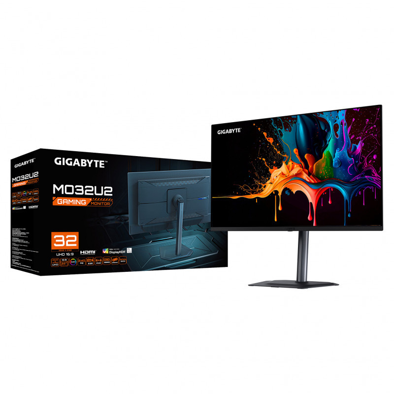 "GIGABYTE MO32U2 32” OLED 4K UHD Gaming Monitor - 3840 x 2160, 240Hz, 0.03ms, 250 cd/m², G-Sync Compatible, FreeSync Premium Pro, Display HDR True Black 400, HDMI 2.1, Displayport 1.4. Display diagonal: 80 cm (31.5""), Display resolution: 3840 x 2160 pixels, HD type: 4K Ultra HD, Display technology: QD-OLED, Response time: 0.03 ms, Native aspect ratio: 16:9, Viewing angle, horizontal: 178°, Viewing angle, vertical: 178°. Built-in speaker(s). Built-in USB hub. VESA mounting, Height adjustment. Product colour: Black"\n"Experience the ultimate gaming upgrade with the GIGABYTE MO32U2. Designed to enhance your competitive edge with 4K QD-OLED technology, a remarkable 240Hz refresh rate, unique Tactical Switch, and AI-based OLED Care, the GIGABYTE MO32U2 gaming monitor empowers you to achieve triumph without compromise."