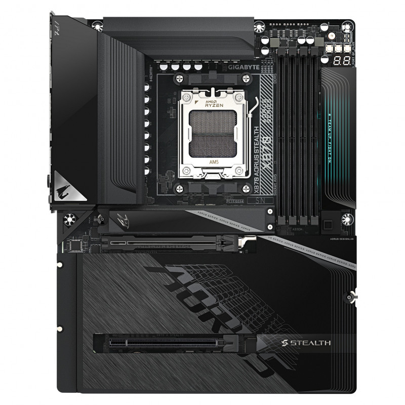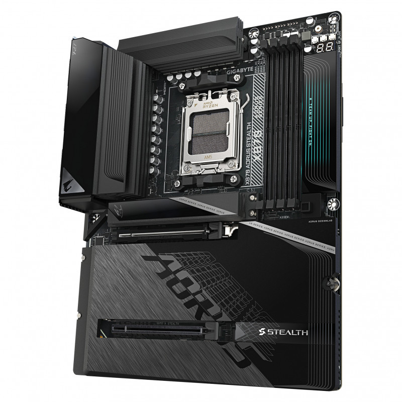 "GIGABYTE X870 AORUS STEALTH Motherboard - Supports AMD Ryzen 9000 CPUs, 16+2+2 Phases Digital VRM, up to 8200Hz DDR5 (OC), 2xPCIe 5.0 + 2xPCIe 4.0, Wi-Fi 7, 5 GbE LAN, USB 4. Processor manufacturer: AMD, Processor socket: Socket AM5, Compatible processor series: AMD Ryzen 7000 Series, AMD Ryzen 8000 Series, AMD Ryzen 9000 Series. Supported memory types: DDR5-SDRAM, Maximum internal memory: 256 GB, Memory slots type: DIMM. Supported storage drive interfaces: M.2, PCI Express 4.0, PCI Express 5.0, SATA III, Supported storage drive types: HDD & SSD, RAID levels: 0, 1, 5, 10. Maximum resolution: 4096 x 2160 pixels. Ethernet interface type: 2.5 Gigabit Ethernet, 5 Gigabit Ethernet, Fast Ethernet, Gigabit Ethernet, LAN controller: Realtek RTL8126, Top Wi-Fi standard: Wi-Fi 7 (802.11be)"\n"Elevate your computing experience with GIGABYTE's renowned motherboard series: AORUS, AERO, and GIGABYTE. Featuring innovative designs and advanced features, these boards offer exceptional performance and reliability. Whether you're a gamer, content creator, or professional, our series cater to your needs, ensuring uncompromising quality and cutting-edge technology."