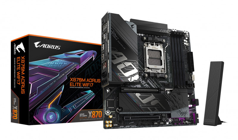 "GIGABYTE X870M AORUS ELITE WIFI7 ICE Motherboard - Supports AMD Ryzen 9000 CPUs, 14+2+2 Phases Digital VRM, up to 8200Hz DDR5 (O.C), 1xPCIe 5.0 + 1xPCIe 4.0, Wi-Fi 7, 2.5 GbE LAN, USB 4. Processor manufacturer: AMD, Processor socket: Socket AM5, Compatible processor series: AMD Ryzen 7000 Series, AMD Ryzen 8000 Series, AMD Ryzen 9000 Series. Supported memory types: DDR5-SDRAM, Maximum internal memory: 256 GB, Memory slots type: DIMM. Supported storage drive interfaces: M.2, PCI Express 4.0, PCI Express 5.0, SATA III, Supported storage drive types: HDD & SSD, RAID levels: 0, 1, 5, 10. Maximum resolution: 4096 x 2160 pixels. Ethernet interface type: 2.5 Gigabit Ethernet, Fast Ethernet, Gigabit Ethernet, LAN controller: Realtek RTL8125, Top Wi-Fi standard: Wi-Fi 7 (802.11be)"\n"Elevate your computing experience with GIGABYTE's renowned motherboard series: AORUS, AERO, and GIGABYTE. Featuring innovative designs and advanced features, these boards offer exceptional performance and reliability. Whether you're a gamer, content creator, or professional, our series cater to your needs, ensuring uncompromising quality and cutting-edge technology."