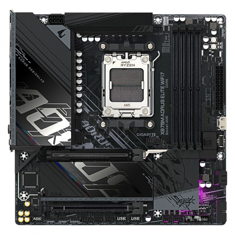 "GIGABYTE X870M AORUS ELITE WIFI7 Motherboard - Supports AMD Ryzen 9000 CPUs, 14+2+2 Phases Digital VRM, up to 8200Hz DDR5 (OC), 1xPCIe 5.0 + 1xPCIe 4.0, Wi-Fi 7, 2.5 GbE LAN, USB 4. Processor manufacturer: AMD, Processor socket: Socket AM5, Compatible processor series: AMD Ryzen 7000 Series, AMD Ryzen 8000 Series, AMD Ryzen 9000 Series. Supported memory types: DDR5-SDRAM, Maximum internal memory: 256 GB, Memory slots type: DIMM. Supported storage drive interfaces: M.2, PCI Express 4.0, PCI Express 5.0, SATA III, Supported storage drive types: HDD & SSD, RAID levels: 0, 1, 5, 10. Maximum resolution: 4096 x 2160 pixels. Ethernet interface type: 2.5 Gigabit Ethernet, LAN controller: Realtek RTL8125, Top Wi-Fi standard: Wi-Fi 7 (802.11be)"\n"Elevate your computing experience with GIGABYTE's renowned motherboard series: AORUS, AERO, and GIGABYTE. Featuring innovative designs and advanced features, these boards offer exceptional performance and reliability. Whether you're a gamer, content creator, or professional, our series cater to your needs, ensuring uncompromising quality and cutting-edge technology."