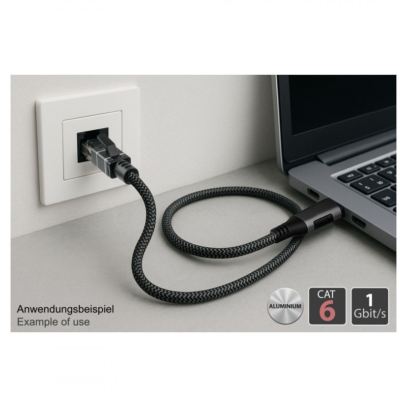 "Alcasa Ethernet cable USB-C™ plug to RJ45 plug, textile sheath, anthracite, 2 m, Good Connections®. Cable length: 2 m, Cable shielding: F/UTP (FTP), Connector 1: USB Type-C, Connector 2: RJ-45, Connector contacts plating: Gold, Data transfer rate: 1000 Mbit/s, Product colour: Anthracite"\n"With the high-quality USB-C™ to RJ45 cable from Good Connections®, you can connect USB-C™-enabled devices such as laptops, tablets, or smartphones directly to a wired Ethernet network—without installing any drivers. Ideal for work environments where stability, speed, and reliability are required. Robust design meets performance The cable is covered with a durable textile braid that not only looks stylish but also provides optimal protection against cable breakage and daily wear and tear. The integrated chip ensures fast plug-and-play recognition and stable data transfer. Reliable in any situation - especially when Wi-Fi fails Whether streaming films in high resolution, making video calls without stuttering, cloud gaming, uploading large files or for live transmission of online meetings and presentations - in all these cases, a wired connection ensures maximum stability and a constant data rate. Especially in environments with overloaded or weak Wi-Fi networks, this cable is the reliable alternative for smooth working and media consumption. Intelligent chipset - conventional adapters are a thing of the past The integrated high-performance chipset from Realtek (RTL8153E) enables a stable 1 Gigabit data connection with maximum compatibility. In contrast to older, often error-prone adapter solutions, this cable offers a seamless and reliable connection. This makes the separate use of bulky adapters superfluous. Real Plug & Play function Plug in and get started - without any additional software or drivers. The integrated chipset is automatically recognized by the operating system and establishes a reliable network connection. Ideal for reliable use in the home office, in the office, when streaming or on the move. Wide compatibility The adapter cable is compatible with a wide range of modern devices. Supported devices include MacBook Pro/Air, iPad Pro, Windows notebooks (e.g. from Lenovo, HP or Dell), Chromebooks and Android devices with USB-C™ connection. Works with macOS, Windows, Linux and ChromeOS. Technical data: - USB-C™ to RJ45 adapter cable - Suitable for 1 Gigabit networks, downwards compatible - Connection 1: USB-C™ plug with Realtek RTL8153E chipset - Connection 2: RJ45 plug with latching nose protection - Gold-plated contacts - Shielding: F/UTP - Conductor material and contacts made of copper (CU) - Cable sheath material: PVC + textile braiding - Outer sheath diameter: 6.3 mm +/- 0.1 mm Color: anthracite Length: 2m