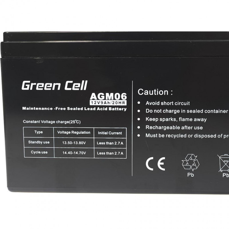 "Green Cell AGM06. Battery technology: Sealed Lead Acid (VRLA), Battery voltage: 12 V, Number of batteries included: 1 pc(s). Weight: 2.3 kg, Width: 151 mm, Height: 95 mm"\n"Green Cell AGM accumulator with a capacity of 12V is made from highest quality materials. The device is perfect to be used heavily, but also to be used from time to time. The accumulator is based on AGM technology, which means that the electrolyte is absorbed by a fiberglass separator, preventing its leakage. This way the device can work in different positions, not just vertically. This is a perfect and much safer alternative for lead-acid accumulators."