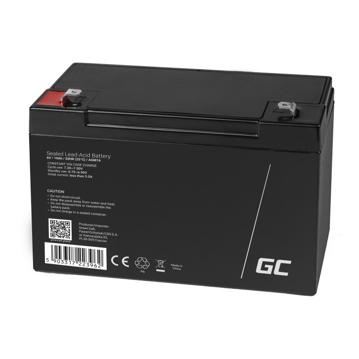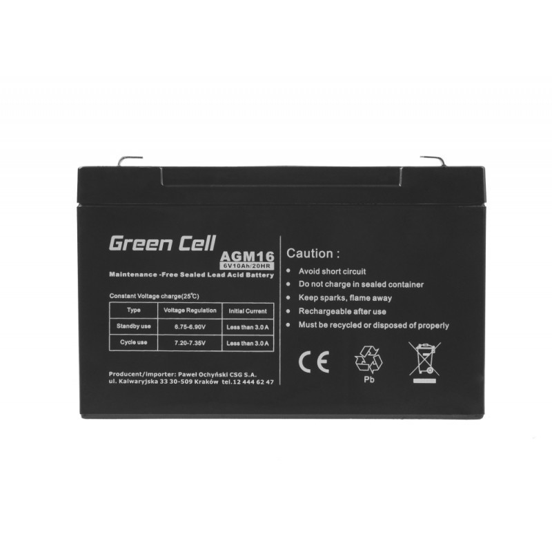 "Green Cell AGM16. Battery technology: Sealed Lead Acid (VRLA), Battery voltage: 6 V, Number of batteries included: 1 pc(s). Weight: 1.45 kg, Width: 50 mm, Height: 94 mm"\n"Green Cell AGM accumulator with a capacity of 6V is made from highest quality materials. The device is perfect to be used heavily, but also to be used from time to time. The accumulator is based on AGM technology, which means that the electrolyte is absorbed by a fiberglass separator, preventing its leakage. This way the device can work in different positions, not just vertically. This is a perfect and much safer alternative for lead-acid accumulators."