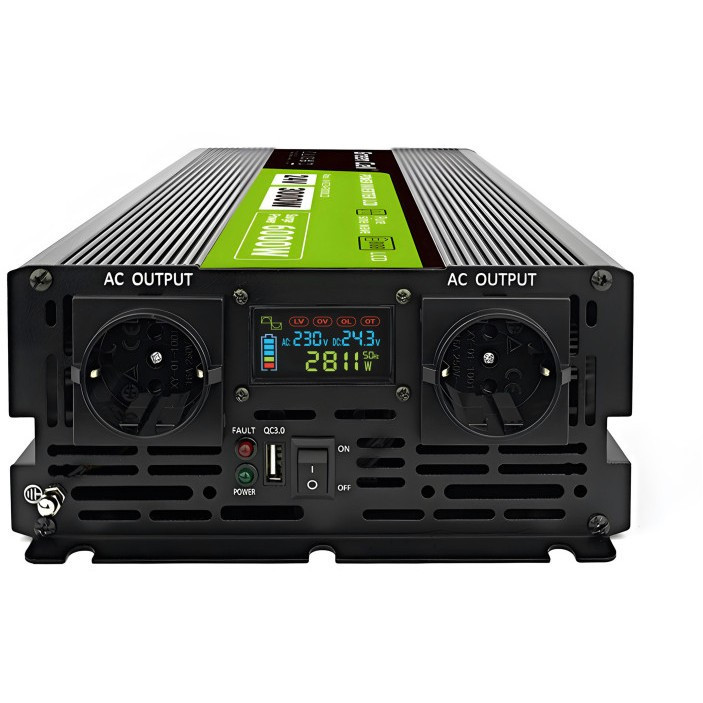 "Green Cell Przetwornica napicia PowerInverter LCD 24 V 3000W/60000W Przetwornica samochodowa z wywietlaczem - czysty sinus. Purpose: Car inverter, Power supply type: Auto, Input voltage: 24 V. Product colour: Black, Housing material: Aluminium, Cooling type: Active. Quantity per pack: 1 pc(s), Cables included: DC"\n"Przetwornica napięcia Green Cell PowerInverter LCD 24 V 3000W/6000W. Czysty sinus z wyświetlaczem, inteligentnymi zabezpieczeniami i aktywnych chłodzeniem dla długotrwałej, bezawaryjnej pracy