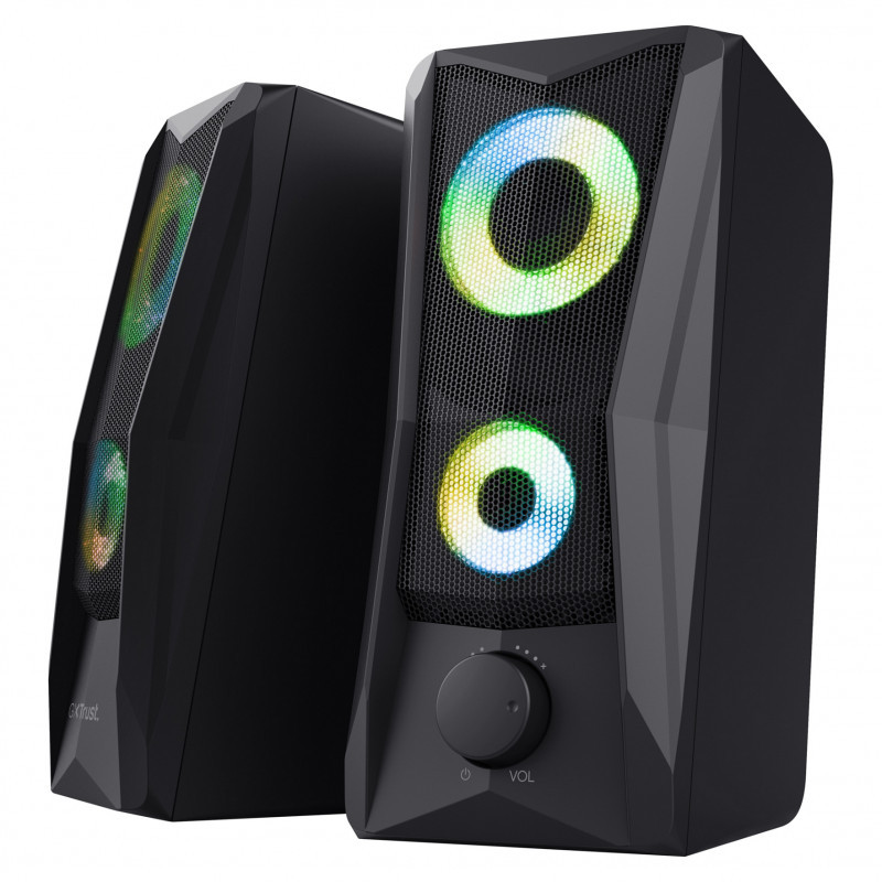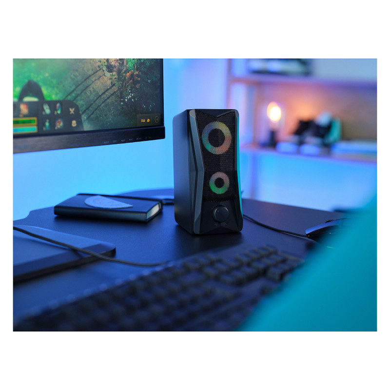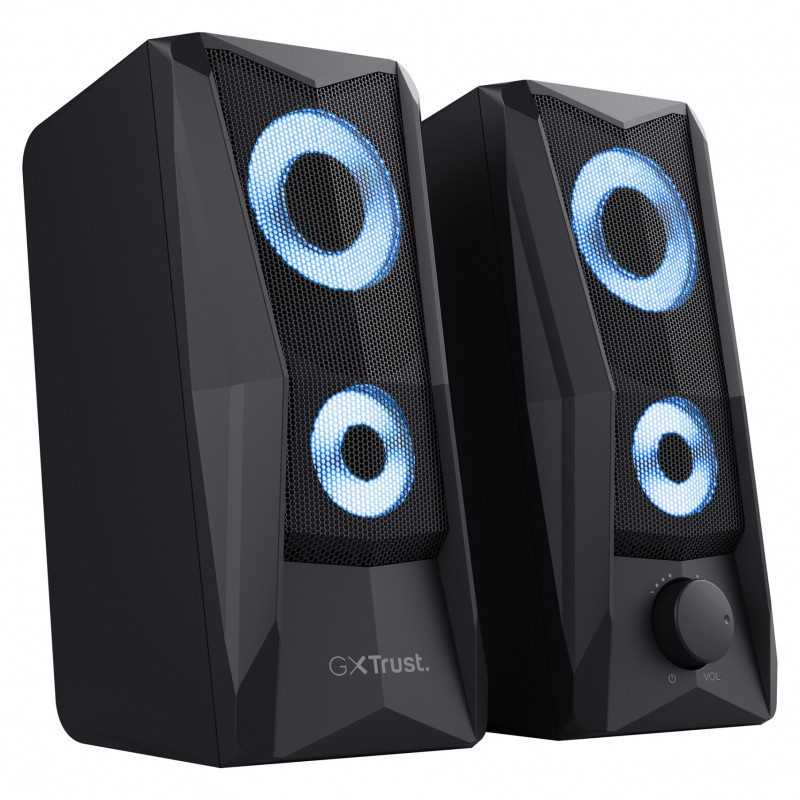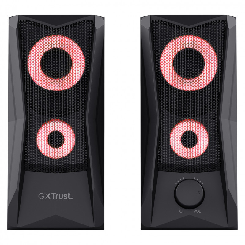 "Trust GXT 606 JAVV. Recommended usage: Universal. Audio output channels: 2.0 channels, Number of drivers: 2. Connectivity technology: Wired. RMS rated power: 12 W, Frequency range: 160 - 20000 Hz, Impedance: 4 Ω. Product colour: Black"\n"Small speaker, big sound