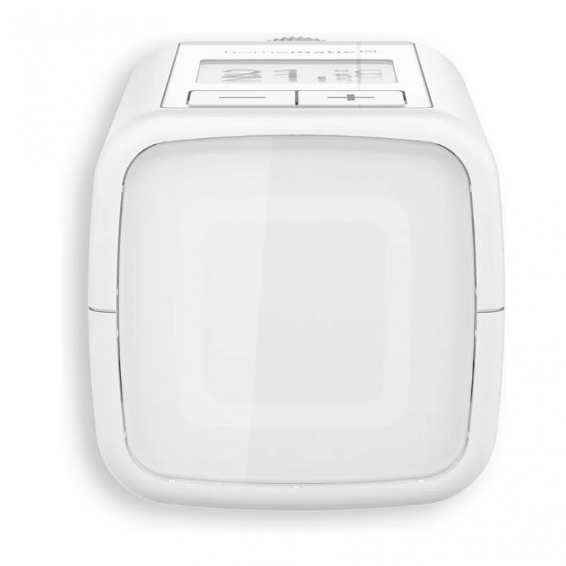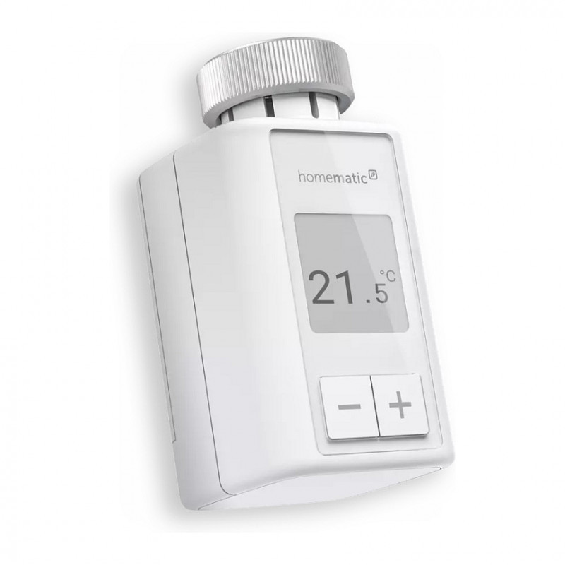 "Homematic IP HmIP-eTRV-F. Type: Digital thermostat, Proper use: Room, Interface: RF. Display: E Ink. Power source: Battery, Battery type: AA, Battery voltage: 1.5 V. Width: 53 mm, Depth: 94 mm, Height: 52 mm. Compliance certificates: CE"\n"The three individually programmable heating schedules enable you to you cut your heating costs by up to 33%. The large, high-contrast e-paper display ensures excellent temperature readability and can be flexibly adjusted to any mounting orientation.