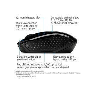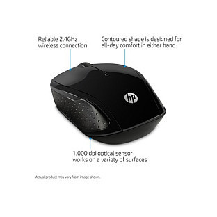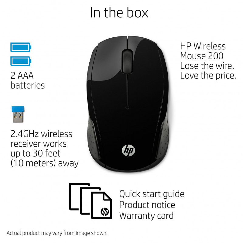 "HP Wireless Mouse 200. Form factor: Ambidextrous. Movement detection technology: Optical, Device interface: RF Wireless, Movement resolution: 1000 DPI, Buttons type: Pressed buttons, Buttons quantity: 2, Scroll type: Wheel. Power source: Batteries. Product colour: Black"\n"Lose the wire. Love the price.