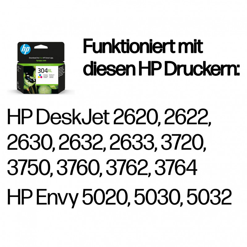 "HP 304XL Tri-color Original Ink Cartridge. Colour ink type: Dye-based ink, Cartridge capacity: High (XL) Yield, Colour ink page yield: 300 pages, Colour ink volume: 7 ml, Printing colours: Cyan, Magenta, Yellow, Quantity per pack: 1 pc(s)"\n"Ideal for creating colour photos and everyday documents with consistent, high-quality results for the life of your cartridge – for an affordable price.