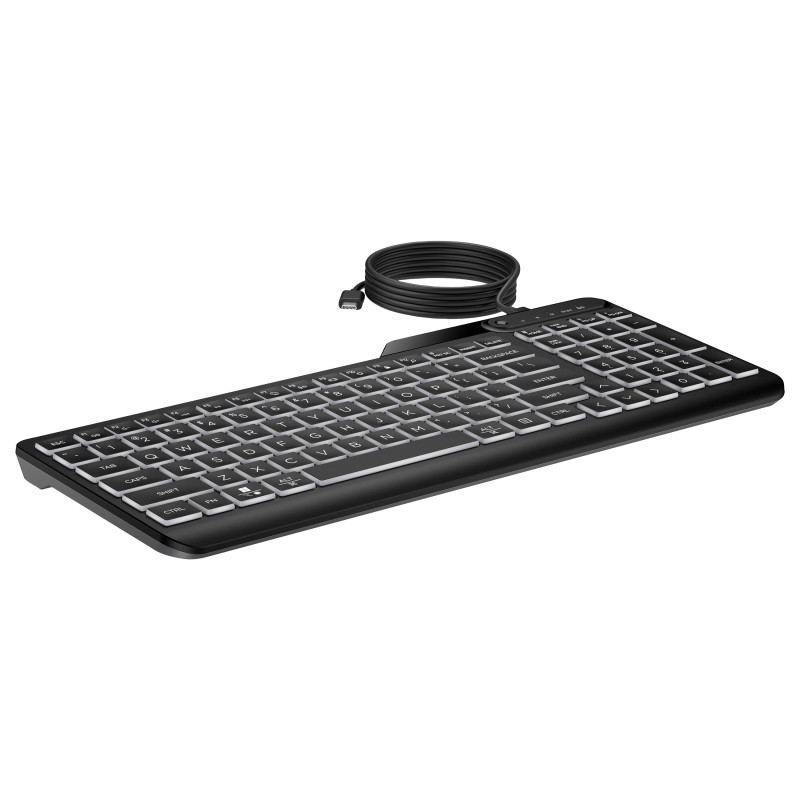 "HP 400 Backlit Wired Keyboard. Keyboard form factor: Full-size (100%), Connectivity technology: Wired, Device interface: USB, Recommended usage: Home. Product colour: Black"\n"The 24/7 keyboard