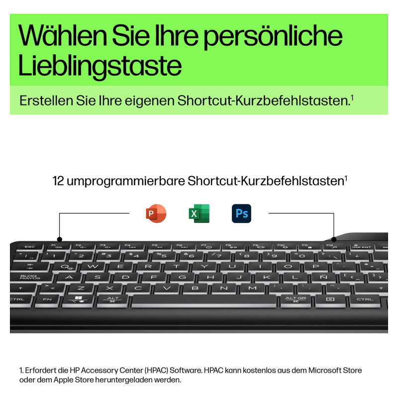 "HP 405 Multi-Device Backlit Wired Keyboard. Keyboard form factor: Full-size (100%), Connectivity technology: Wired, Device interface: USB, Keyboard key switch: Membrane, Recommended usage: Office. Product colour: Black"\n"The 24/7 keyboard