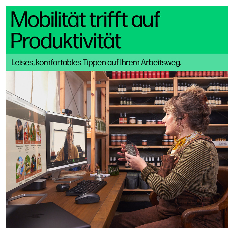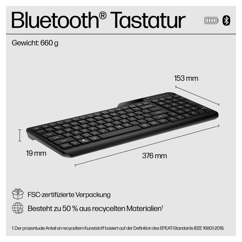 "HP 460 Multi-Device Bluetooth Keyboard. Connectivity technology: Wireless, Device interface: Bluetooth, Recommended usage: Home. Product colour: Black"\n"Full keyboard. Fully mobile. Fully your type.