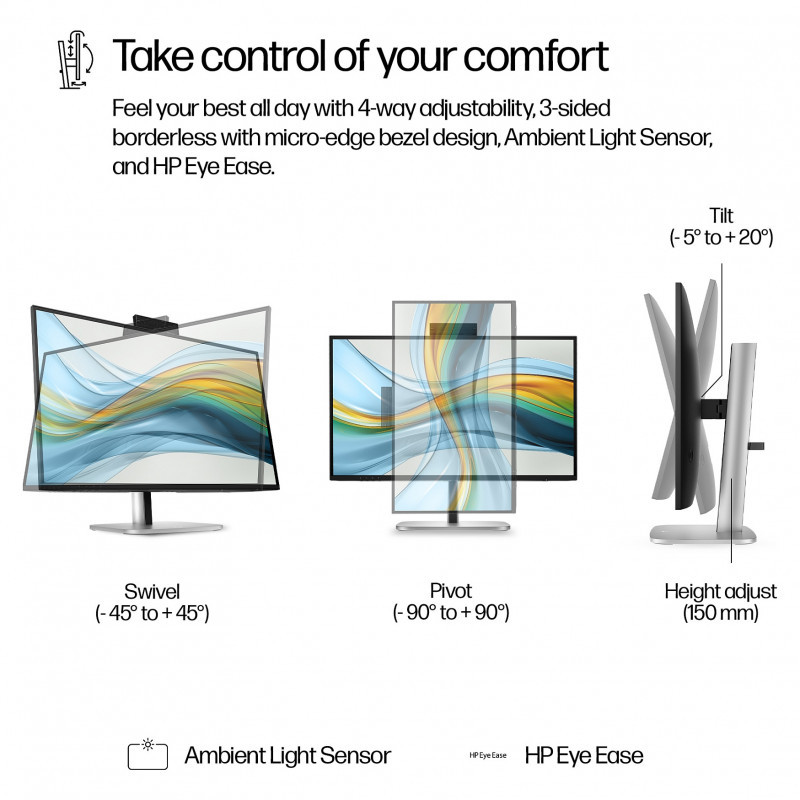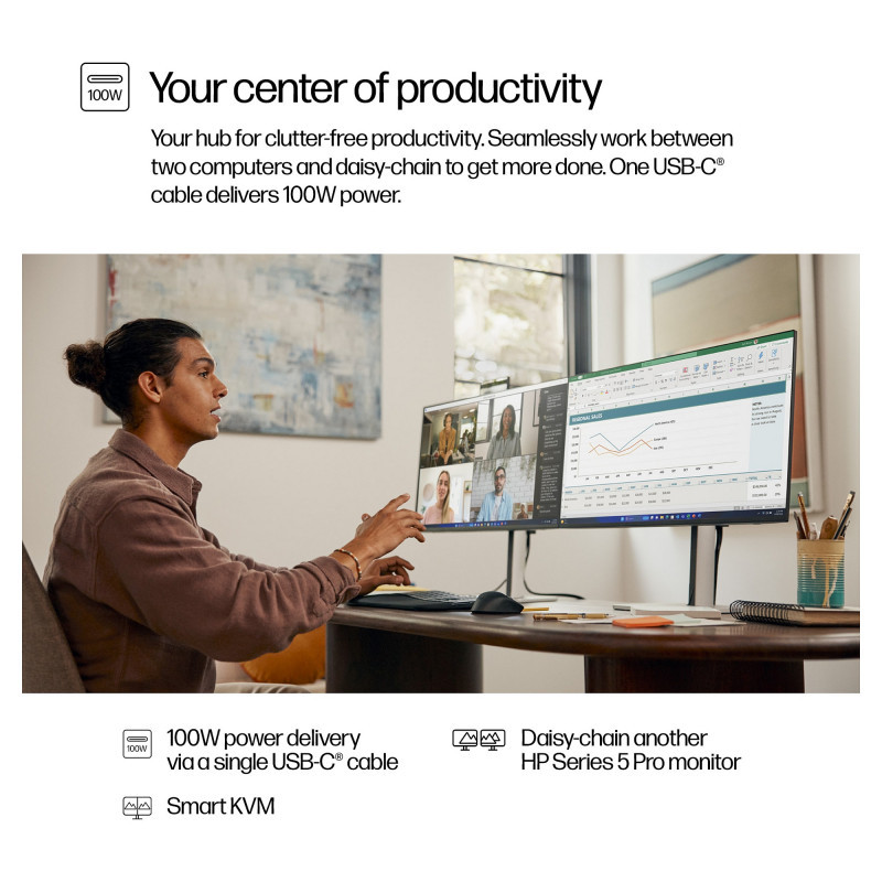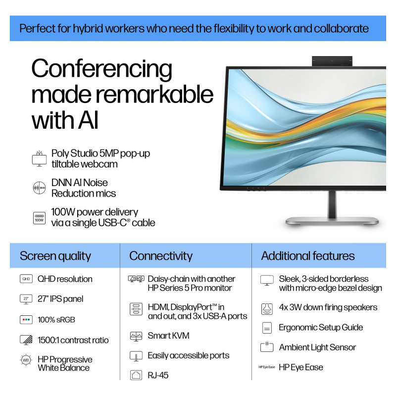 Feel confident collaborating effortlessly with the HP Series 5 Pro 27"" QHD USB-C Conferencing Monitor. Achieve distraction-free meetings, wherever you work, with advanced AI. Settle into total comfort thanks to a customizable setup."