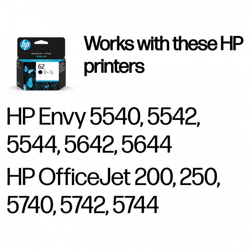 "HP 62 Black Original Ink Cartridge. Cartridge capacity: Standard Yield, Black ink type: Pigment-based ink, Black ink volume: 4 ml, Printing colours: Black, Quantity per pack: 1 pc(s), Black ink page yield: 200 pages"\n"Reliably produce high quality long-lasting documents with sharp graphics and crisp text for virtually any need.[1]