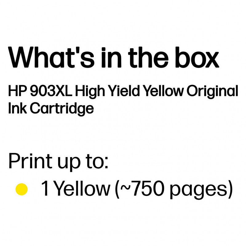 "HP 903XL High Yield Yellow Original Ink Cartridge. Colour ink type: Pigment-based ink, Cartridge capacity: High (XL) Yield, Colour ink page yield: 750 pages, Colour ink volume: 8.5 ml, Printing colours: Yellow, Quantity per pack: 1 pc(s)"\n"Ideal for busy entrepreneurs and small-business owners who want to make a professional impression and serve the bottom line.