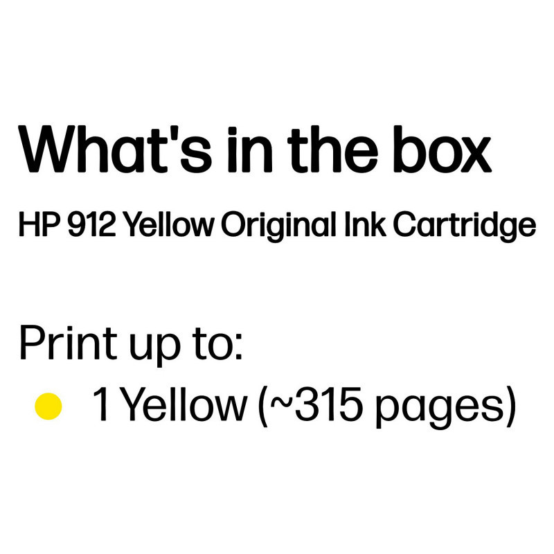 "HP 912 Yellow Original Ink Cartridge. Colour ink type: Pigment-based ink, Cartridge capacity: Standard Yield, Colour ink page yield: 315 pages, Colour ink volume: 2.9 ml, Printing colours: Yellow, Quantity per pack: 1 pc(s)"\n"Ideal for workgroups who need dependable performance for professional-quality printing, page after page.