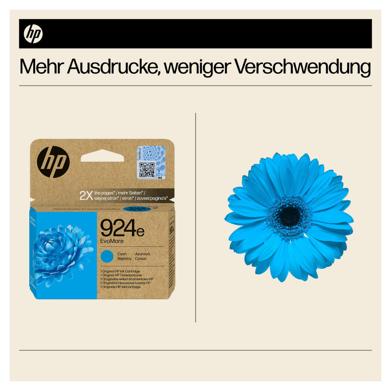 "HP 924e EvoMore Cyan Original Ink Cartridge. Cartridge capacity: High (XL) Yield, Supply type: Single pack, Colour ink page yield: 800 pages, Printing colours: Cyan, Quantity per pack: 1 pc(s)"\n"Ideal for high-volume and sustainability-conscious business printing