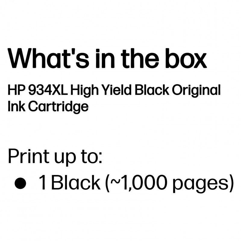 "HP 934XL High Yield Black Original Ink Cartridge. Cartridge capacity: High (XL) Yield, Black ink type: Pigment-based ink, Black ink volume: 25.5 ml, Printing colours: Black, Quantity per pack: 1 pc(s), Black ink page yield: 1000 pages"\n"Ideal for producing high-quality business documents you can count on – at a better value for frequent printing.[1]