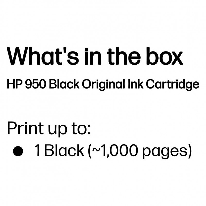 "HP 950 Black Original Ink Cartridge. Cartridge capacity: Standard Yield, Black ink type: Pigment-based ink, Black ink volume: 1000 ml, Printing colours: Black, Quantity per pack: 1 pc(s), Black ink page yield: 1000 pages"\n"Ideal for small businesses to print professional-looking colour and black text that will stay sharp and resist fading – at a low cost.[1,2]