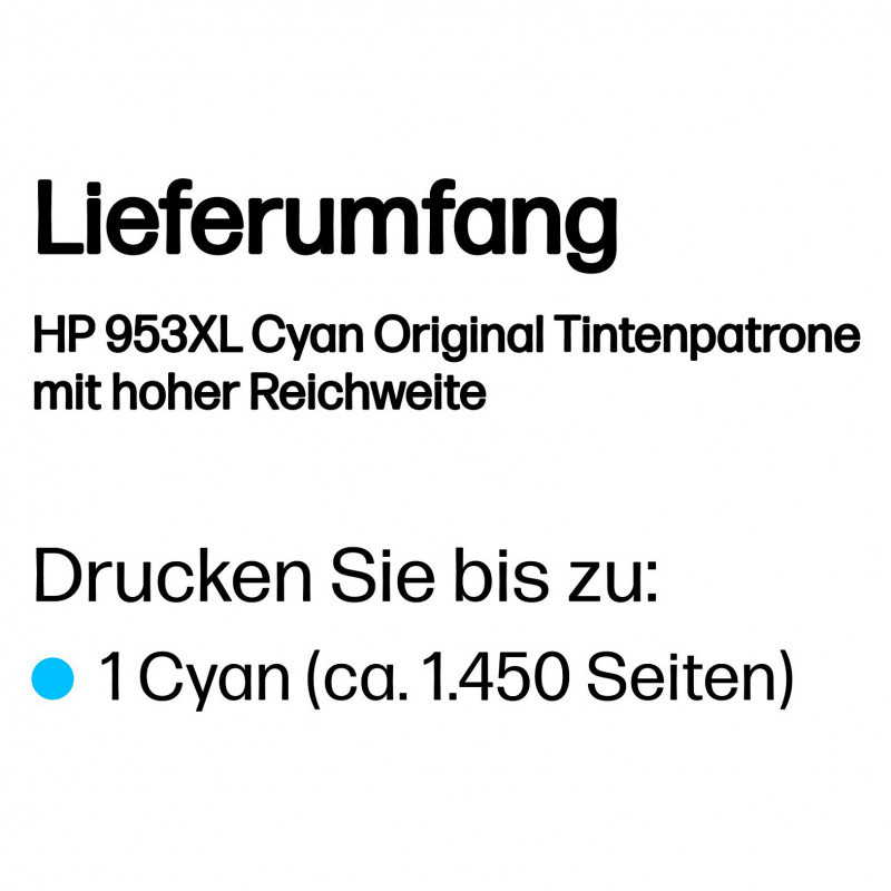 "HP 953XL High Yield Cyan Original Ink Cartridge. Colour ink type: Pigment-based ink, Cartridge capacity: High (XL) Yield, Supply type: Single pack, Colour ink page yield: 1450 pages, Colour ink volume: 18 ml, Printing colours: Cyan, Quantity per pack: 1 pc(s)"\n"Ideal for large workgroups who need dependable performance for affordable, professional-quality printing, page after page.