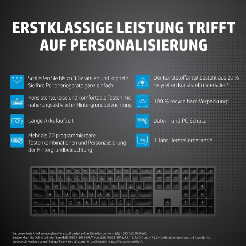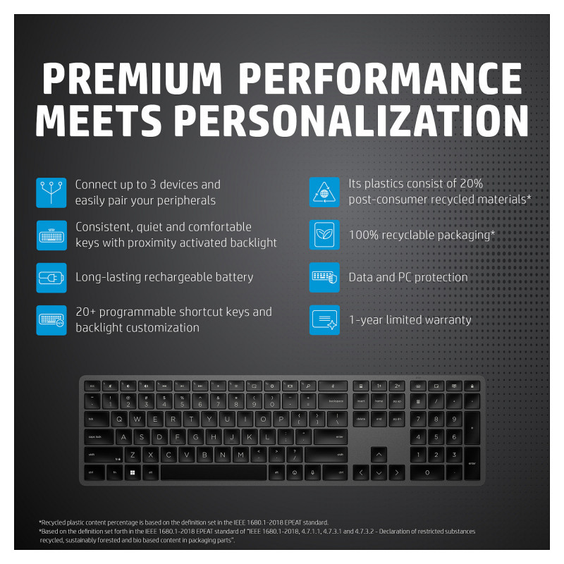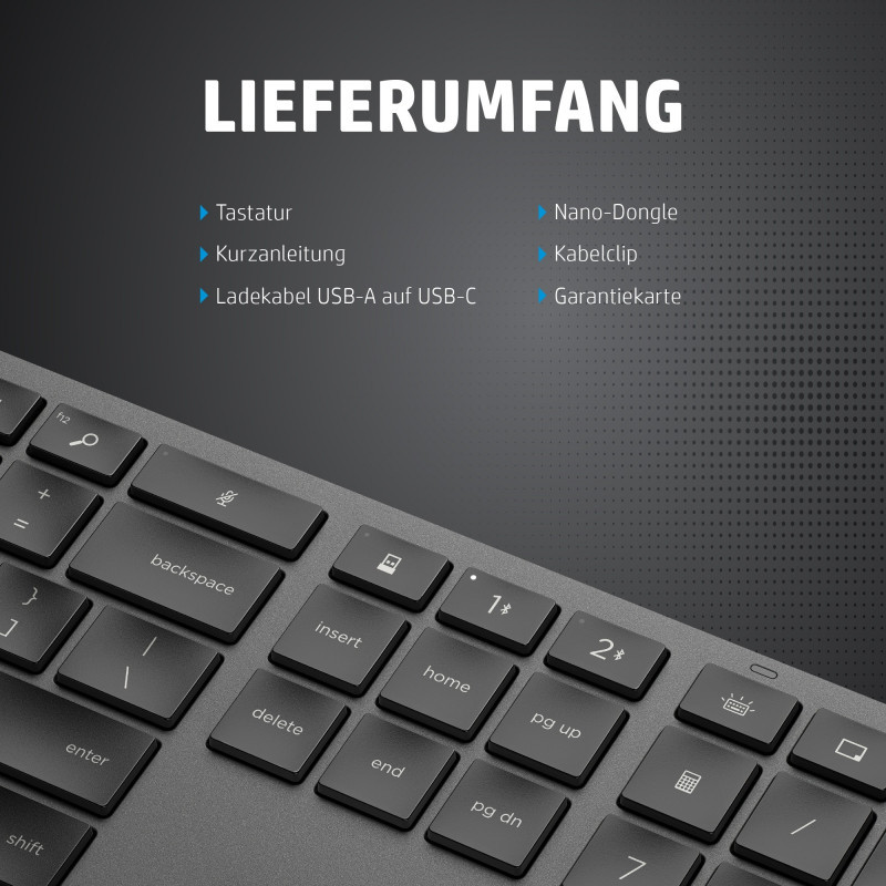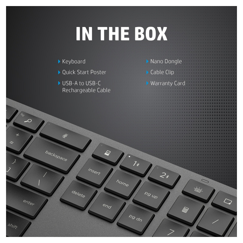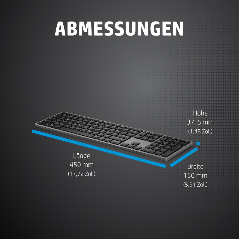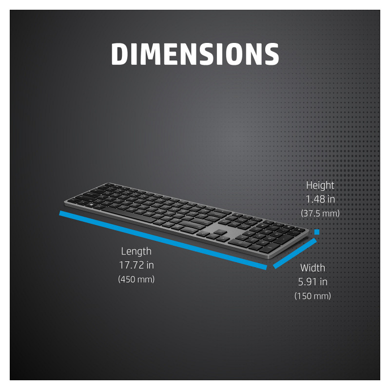 "HP 975 Dual-Mode Wireless Keyboard. Keyboard form factor: Full-size (100%), Connectivity technology: Wireless, Device interface: RF Wireless + Bluetooth. Product colour: Black"\n"Premium Performance Meets Personalization